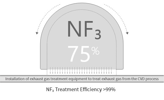 To effectively reduce greenhouse gas emissions, we actively explore production improvements and strive to reduce the usage of specialty gases, thereby controlling the generation of fluorinated gases. As one of the main factors of greenhouse effect gases, the usage of NF₃ accounts for more than 20% of all specialty gases used by CSOT. To reduce NF₃ consumption, we use N₂ process through chemical technology to clean more residues, significantly improving cleaning efficiency and reducing NF₃ usage. Meanwhile, by installing advanced exhaust gas treatment equipment to efficiently treat the exhaust gas generated from the CVD process, we have achieved an NF₃ treatment efficiency of over 99%, ensuring environmental friendliness during production.